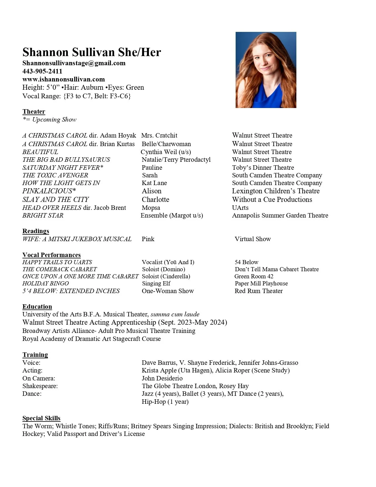Hey! I, Shannon Sullivan, am a contemporary musical theater artist. I am a Philly/New York-based actor now that I have graduated with my B.F.A. in musical theater from University of the Arts.